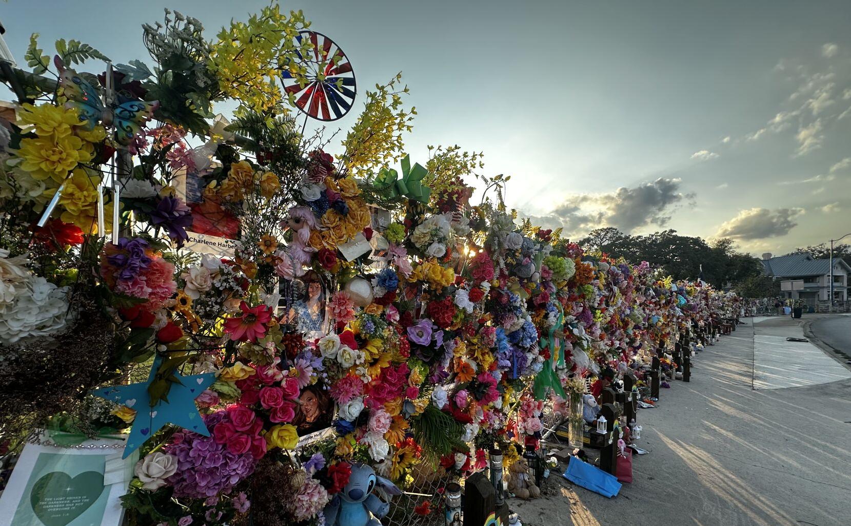 A now 50-foot memorial wall on Water Street in Kerrville also pays tribute to victims. Decorated with flowers, photos, T-shirts left by Christian relief workers with Bible verses written on them, mini-crocheted prayer blankets, it’s also anchored with small wooden crosses lining the pavement. Known as the “Wall of Hope,” it was started by Miami-based artist Leo Soto and visitors continue to add to it.