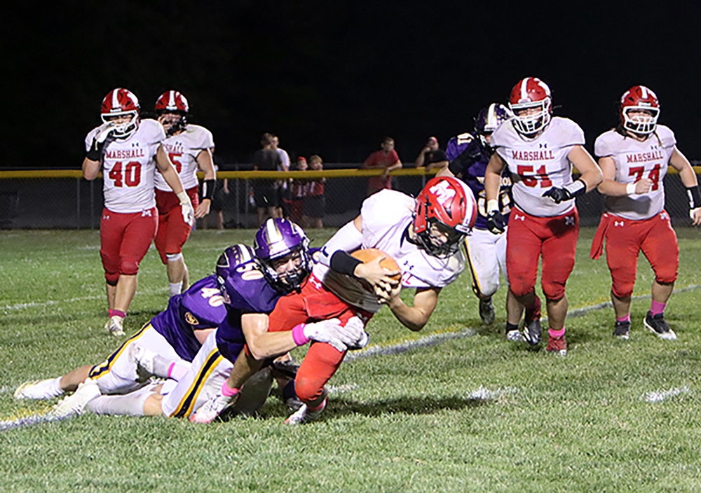 Casey-Westfield’s Luke Karras powers through the Marshall defense for one of his two touchdowns during Friday’s homecoming win. Karras was a workhorse for the Warriors all night, also leading the defense with 15 tackles. (Photo by Terri Cox)