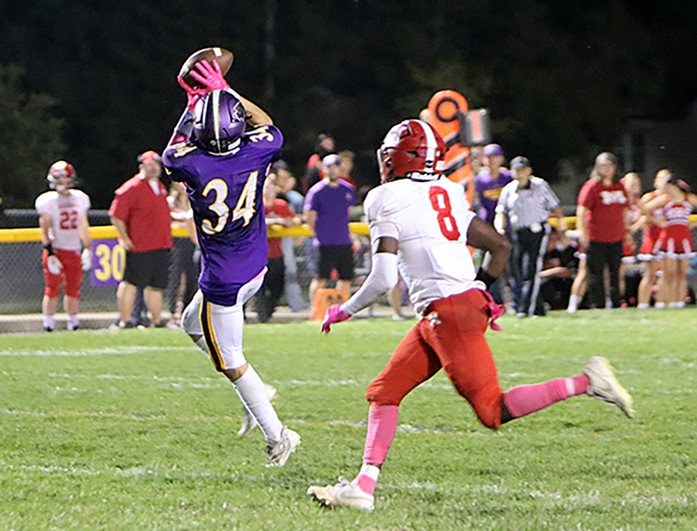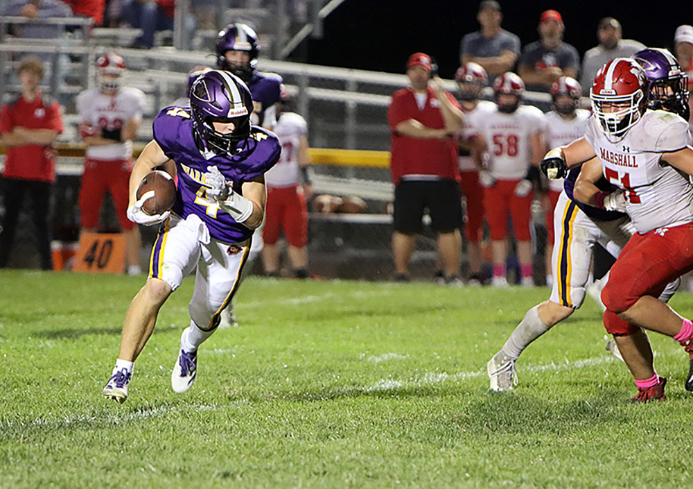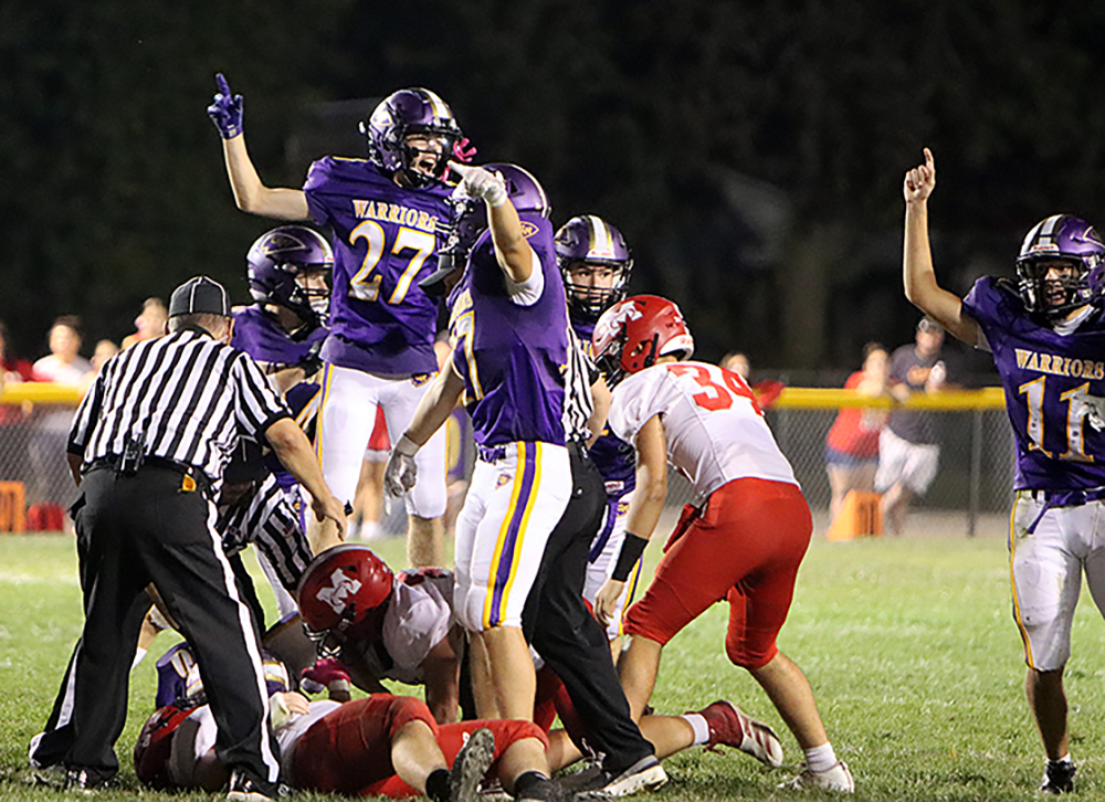 Featured Image Caption: Casey-Westfield’s Daryn Hupp hauls in a fingertip touchdown pass from quarterback Nolan Clement during Friday’s game against Marshall. The spectacular 26-yard reception was a pivotal fourth-quarter play that led to the game-tying two-point conversion, sparking the Warriors’ comeback victory. (Photo by Terri Cox)