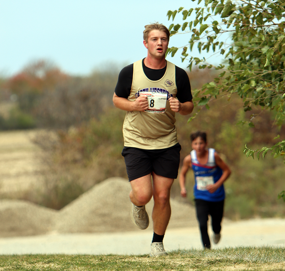 Wade Winnett navigates the course at Lake Land College during Saturday’s regional meet. Winnett finished with a time of 18:46.1 for the Warriors. —photo by Terri Cox