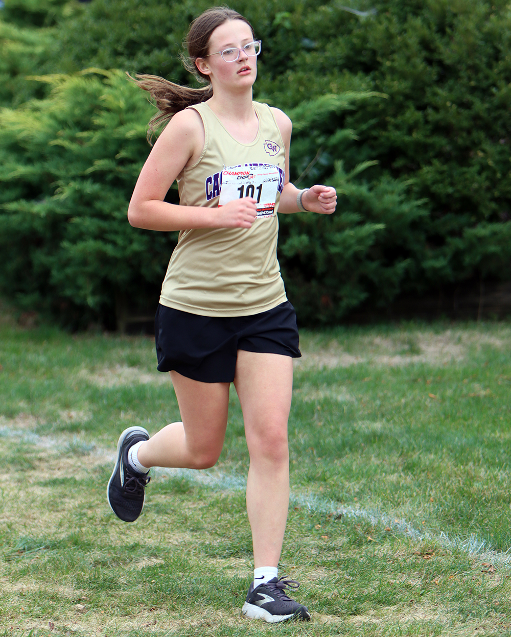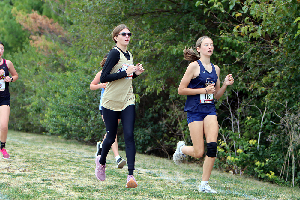 Savannah Lyman rounds out the course for the Lady Warriors. Lyman completed the race in 29:29.0, helping her team clinch its spot in the Sectional meet. —photo by Terri Cox