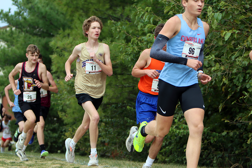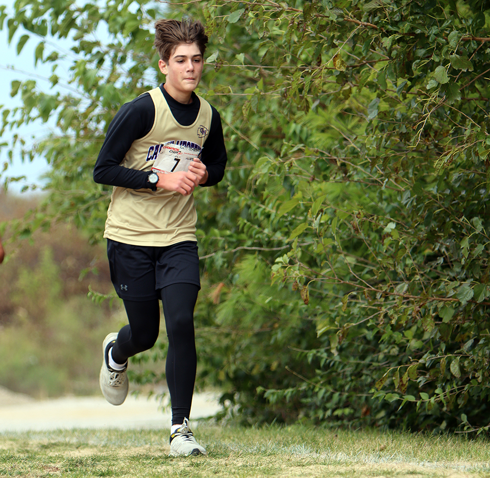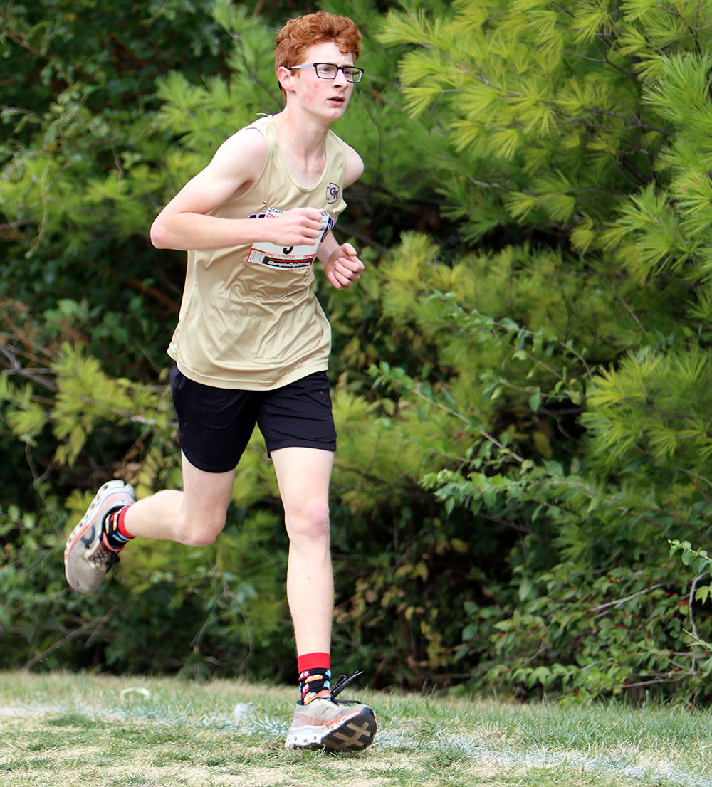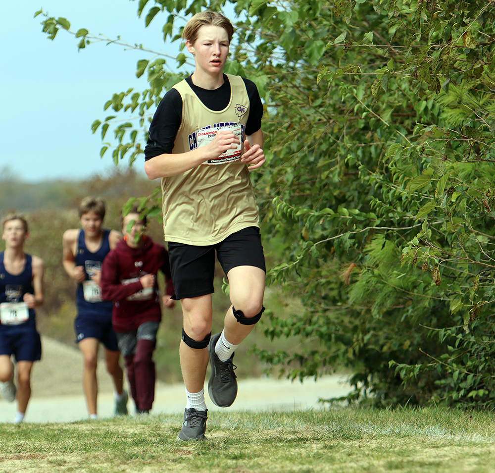 Kaleb Perie pushes through the regional course on Saturday. Perie finished the race with a time of 20:26.7 for the Warriors. —photo by Terri Cox
