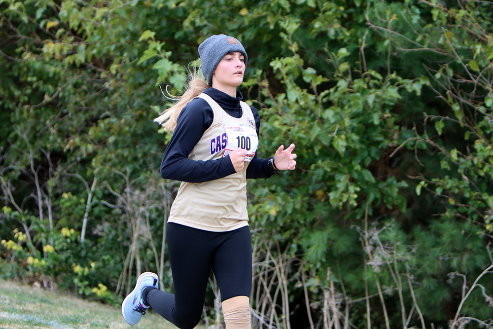 Olivia Henderson races for Casey-Westfield on Saturday morning. Henderson contributed to the Lady Warriors’ team advancement with a final time of 25:44.7. —photo by Terri Cox