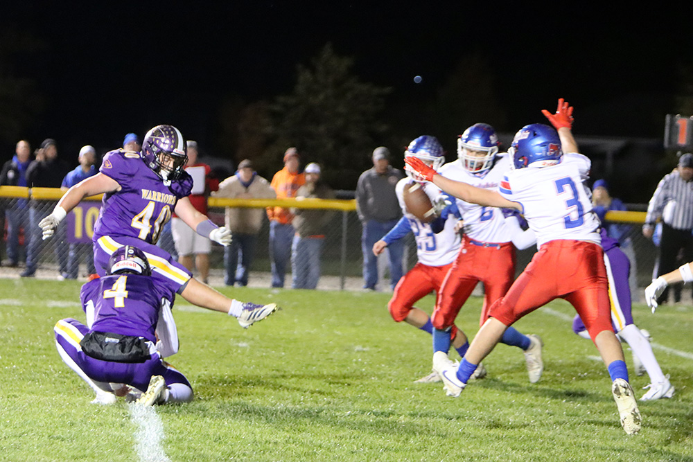 Kicker Wyatt Erickson sends an extra point through the uprights. Erickson had a perfect night, going 5-for-5 on PATs, and also scored a 4-yard rushing touchdown in the fourth quarter.