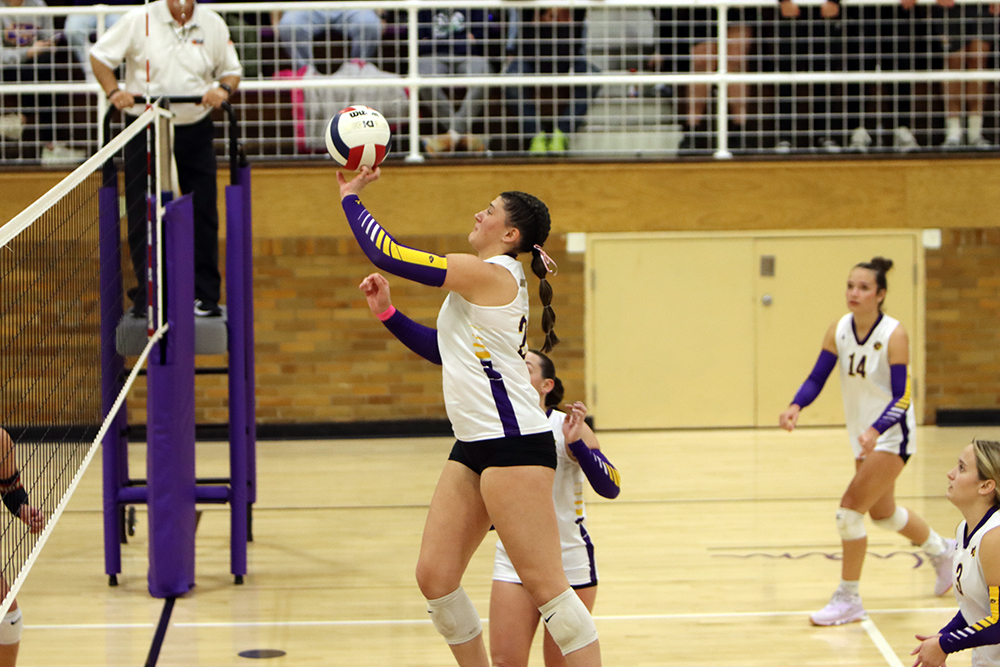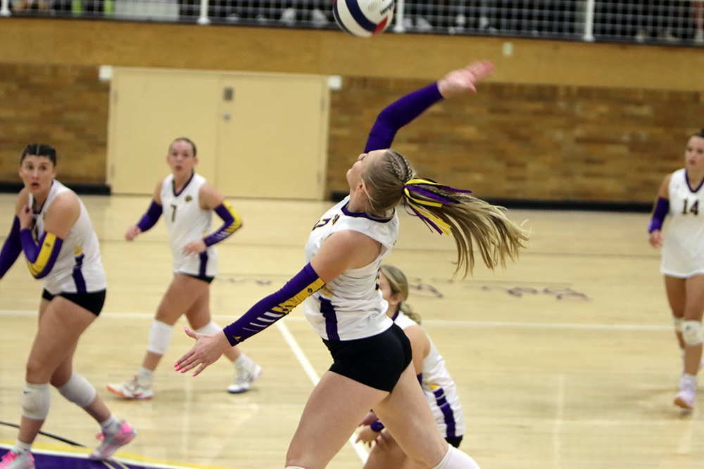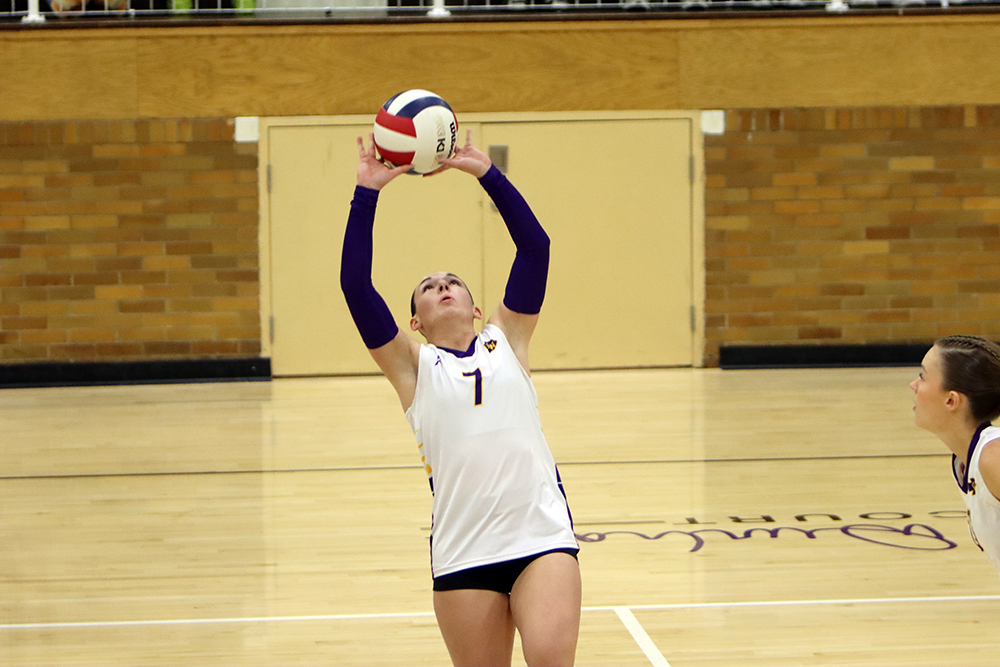 Setter Haley Schackmann prepares to deliver one of her 47 assists from the regional tournament. Schackmann orchestrated the Casey-Westfield offense throughout their run to the championship match. —photo by Terri Cox