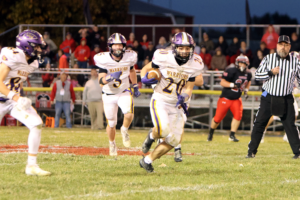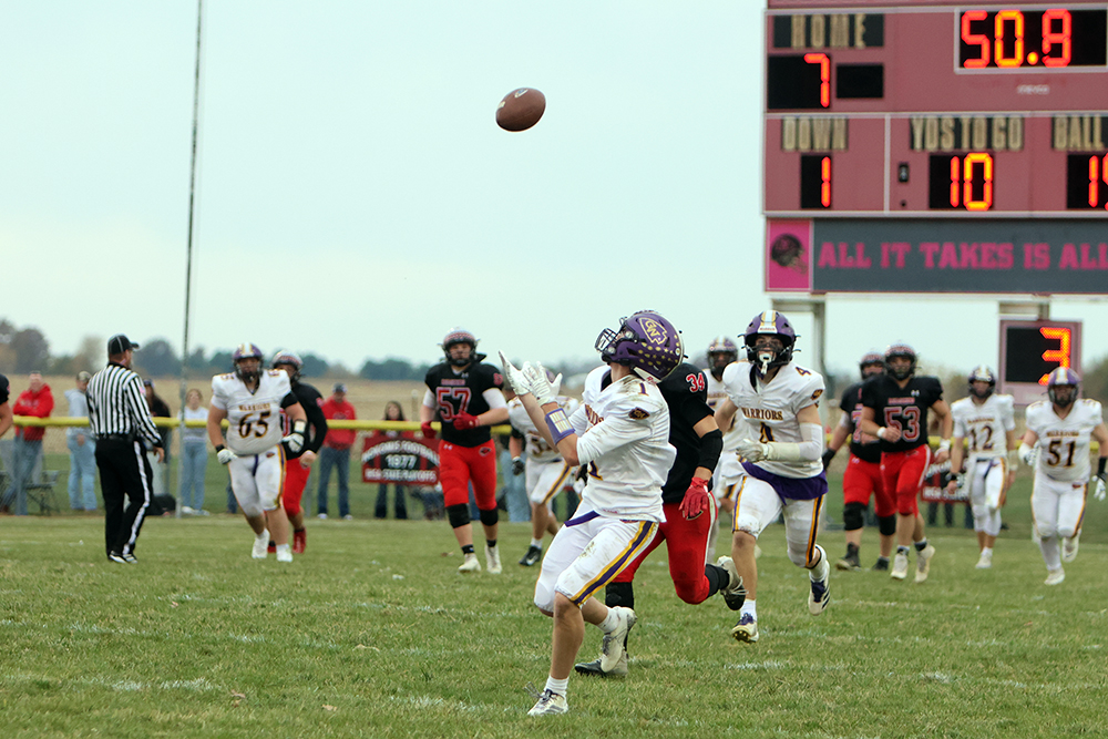 Feature photo caption: Kian Davis comes away with a fourth-quarter interception and returns it deep into Nokomis territory. Davis’s takeaway set up the Warriors’ final touchdown of the game, helping seal the 48-14 victory. —photo by Terri Cox