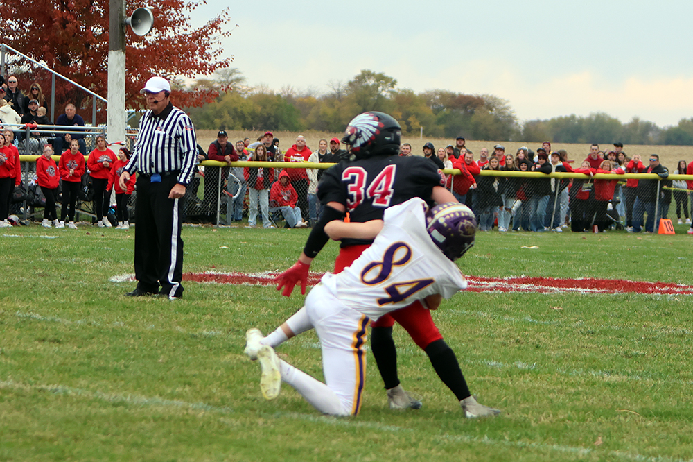 With the game out of reach, the Redskins were forced to pass. Facing fourth-and-five from their own 39, the Nokomis quarterback looked for a receiver over the middle, but Kian Davis intercepted the pass and returned it to the 10-yard line.