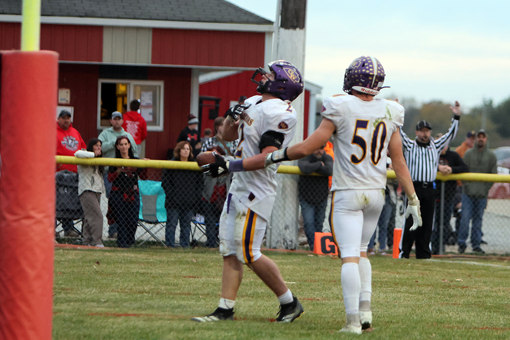 Luke Karras is congratulated by teammate Fred Thomas after scoring on a tough four-yard run in the third quarter. In addition to his touchdown, Karras anchored the defense with a game-high 16 tackles in the playoff win. —photo by Terri Cox