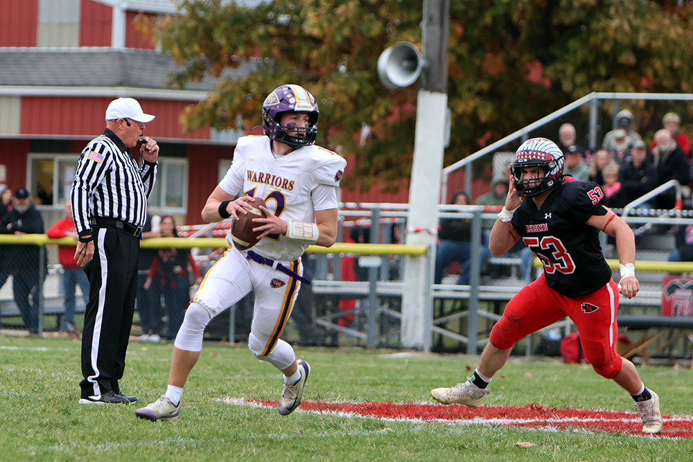 Quarterback Nolan Clement scans the field for an open receiver during the Warriors’ 48-14 playoff victory over Nokomis. Clement was masterful through the air, completing 6-of-10 passes for 203 yards and two long touchdowns. —photo by Terri Cox