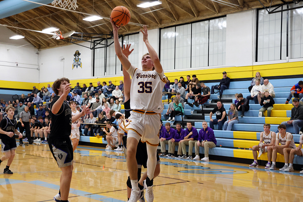 Jackson High goes up for two points during the Warriors’ season-opening rout of Okaw Valley. High was a key contributor on both ends of the floor, finishing with eight points and six rebounds as Casey-Westfield rolled to a 55-26 win.