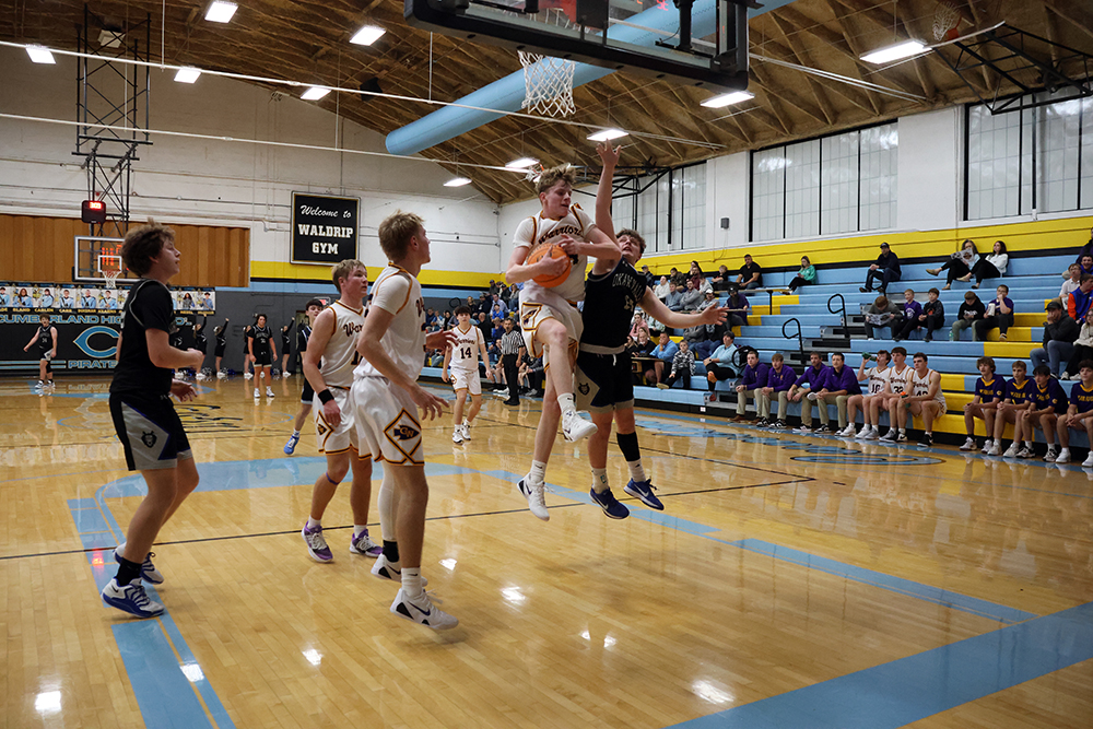 Feature photo caption: Nolan Clement drives hard to the rim for a bucket against the Timberwolves. Clement chipped in eight points as the Warriors built a commanding 32-9 halftime lead and cruised to victory.